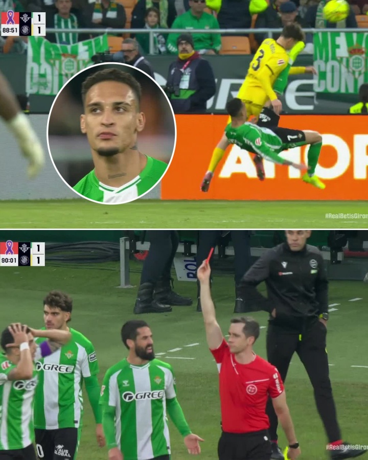 11月24日讯 贝蒂斯本轮1-1战平赫罗纳,第90分钟,安东尼一个倒勾动作踢到对手头部,裁判看VAR后将他直红罚下。